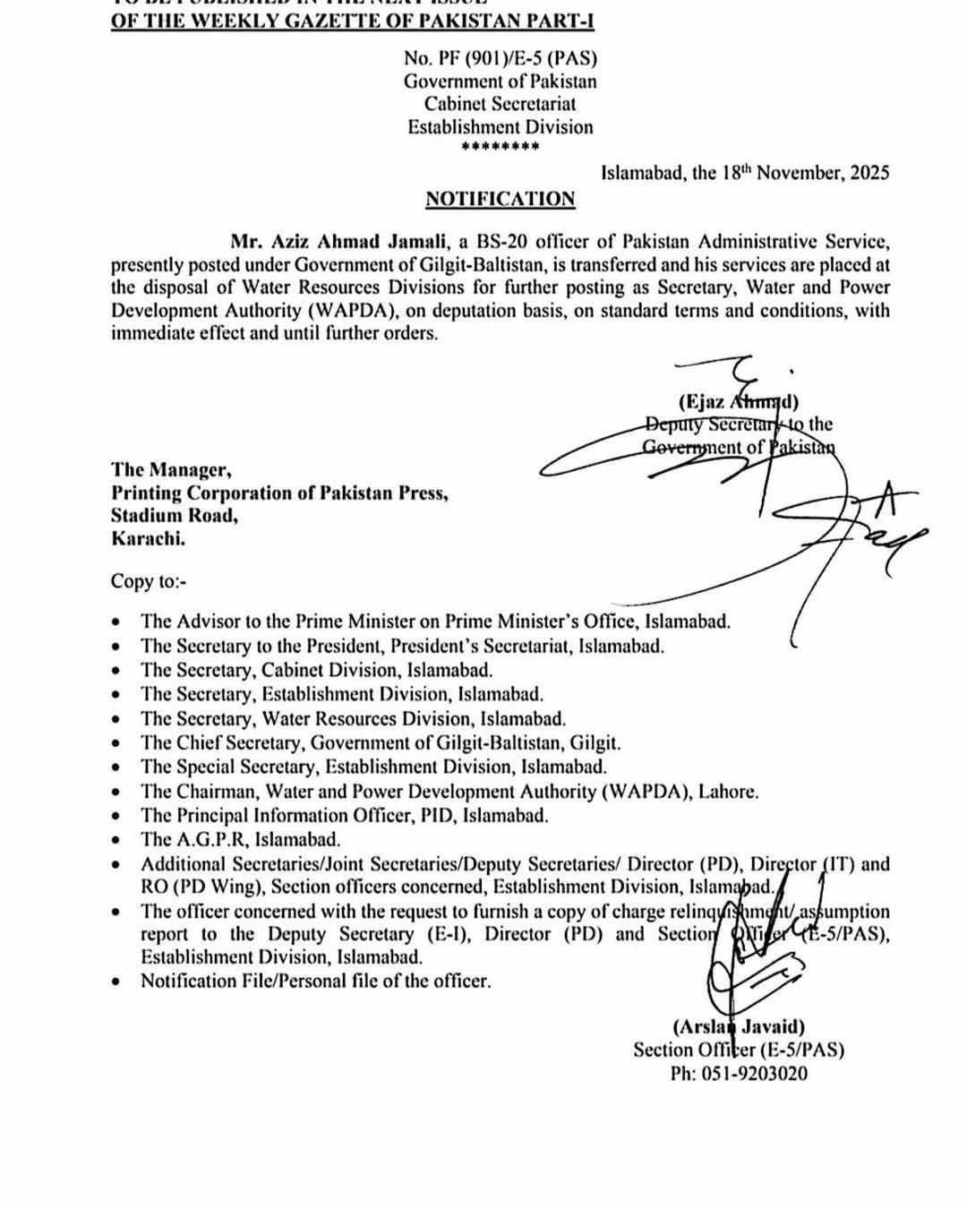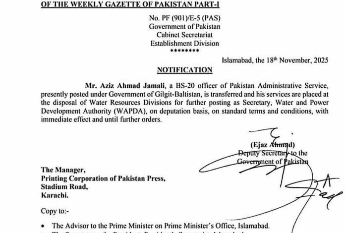 گریڈ 20 کے افسر عزیز احمد جمالی کو سیکرٹری واپڈا تعینات کر دیا گیا