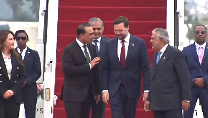 اسلام آباد کے نور خان ایئر بیس پر امریکی نائب صدر جے ڈی وینس کا استقبال آرمی چیف فیلڈ مارشل عاصم منیر، نائب وزیرِ اعظم و وزیرِ خارجہ اسحاق ڈار، وزیرِ داخلہ محسن نقوی اور دیگر حکام نے کیا۔